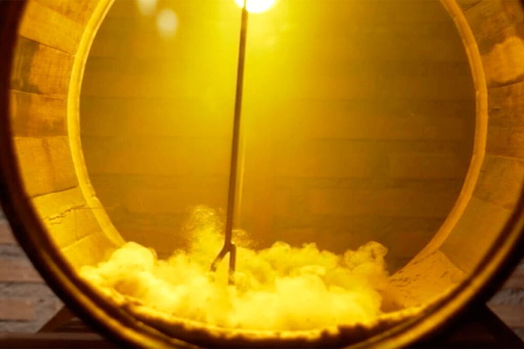 This French term of stirring settled lees into the wine. You might wonder, what does that mean? During fermentation, when yeasts transform sugar into alcohol, residual yeasts settle at the bottom of the tank or barrel, creating a sediment known as lees. This is when the bâtonnage process begins, consisting of introducing a long baton (batôn in French) through the barrel bore to reintegrate residual yeasts into the wine, thereby providing greater complexity, contributing to its weight on the palate, aromas, and flavors.