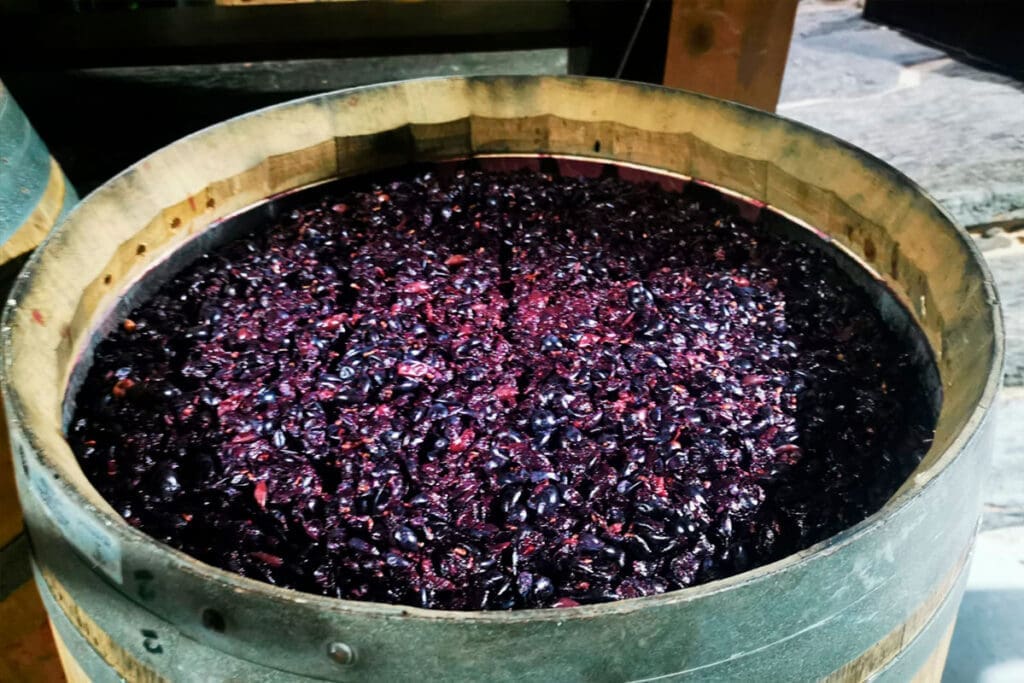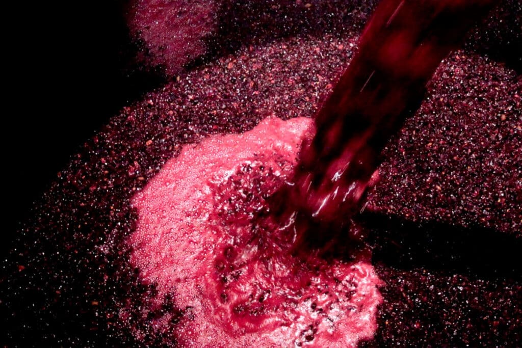 In red winemaking, after the grapes are crushed, the must is fermented with grape skins and pips so that they contribute flavors, aroma, and texture to the final wine. Once alcoholic fermentation occurs, the yeasts release carbon dioxide gas that pushes the skins upward, forming a layer that floats on top of the wine called the cap.