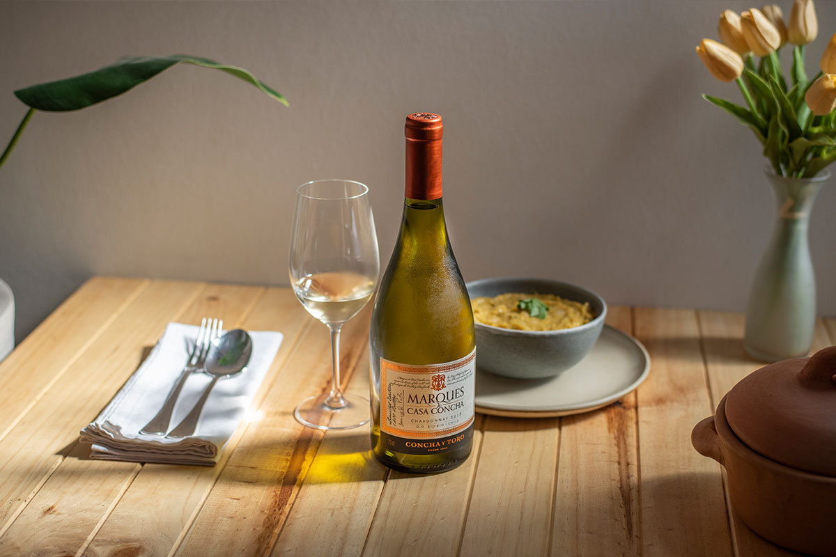 Quando dizemos que um Chardonnay tem madeira, quer dizer que são utilizados barris de madeira na fermentação, na maturação ou em ambos os processos. A madeira permite ao vinho maior oxigenação, o que lhe confere aromas de maçã assada ou de frutos secos por exemplo, uma sensação redonda e cremosa em boca, além de lhe transferir aromas de coco, baunilha e outras especiarias. Também é muito frequente este tipo de Chardonnay ter fermentação malolática (processo no qual bactérias transformam o ácido málico em lático, reduzindo a acidez do vinho), o que exacerba seu perfil cremoso conferindo aromas e sabores de manteiga, avelã, mel e caramelo. Este estilo combina muito bem com pratos à base de carnes brancas como frango, porco ou peixe, preparados com ingredientes como manteiga, creme e ervas e com tempero suave. Também complementa muito bem os sabores torrados de massas assadas e legumes caramelizados. Recomendamos você provar esta harmonização com o Marques de Casa Concha Chardonnay Edición Limitada, ou com o Gran Reserva Serie Riberas Chardonnay, servidos idealmente a uma temperatura próximo a 12 graus Celsius, para tornar a sua experiência ainda melhor.