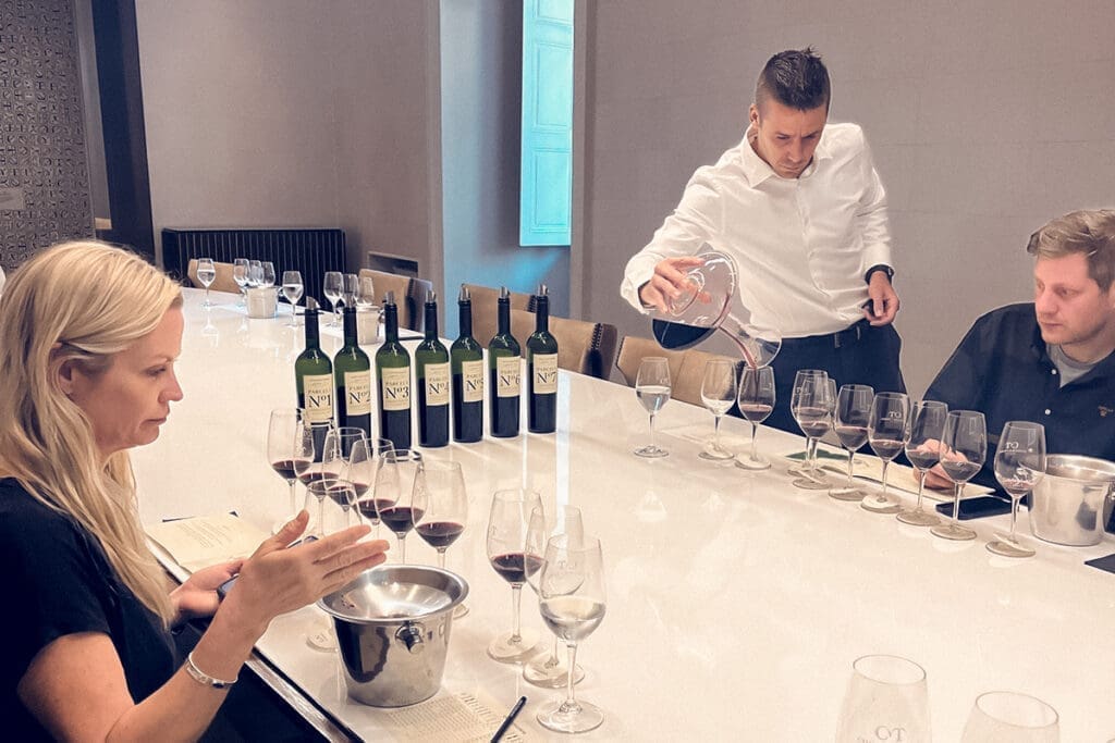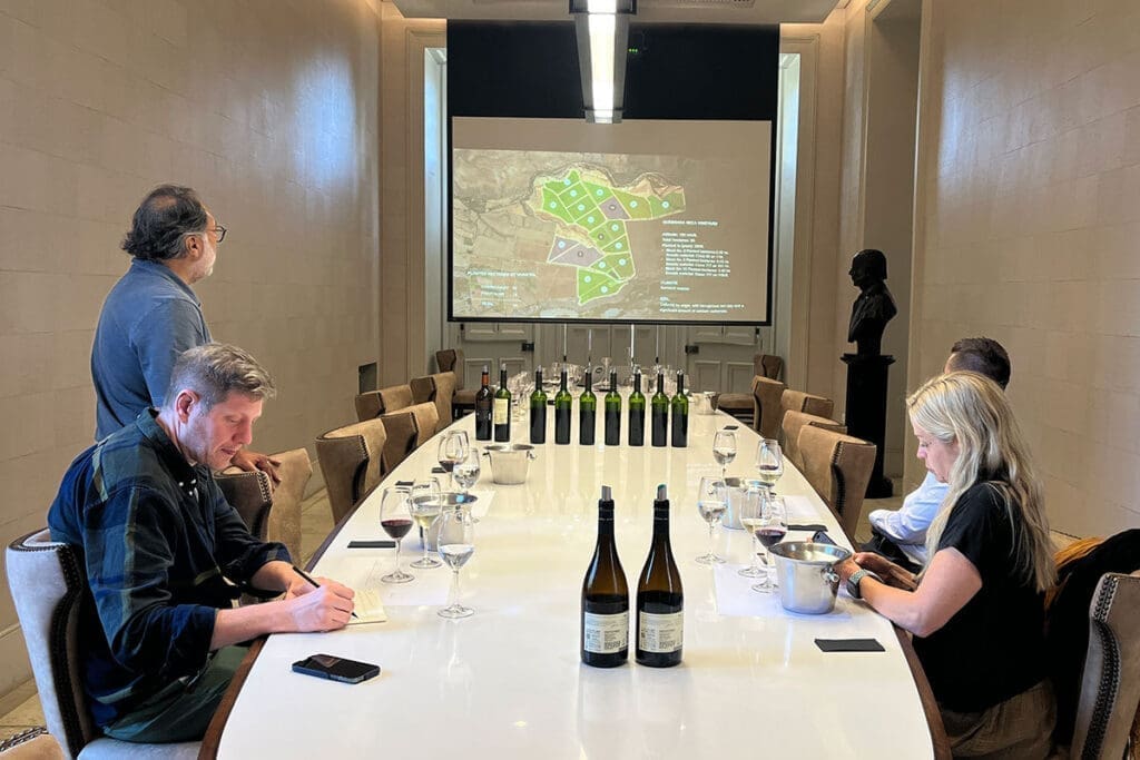 A visita iniciou com a atividade Don Melchor Winemaking Experience, na qual puderam degustar os 7 lotes do vinhedo Don Melchor e observar as diferentes características que cada um deles entrega ao corte final do Don Melchor. Em seguida, degustaram a safra n°35 do Cabernet Sauvignon ícone de Puente Alto: Don Melchor 2021.
