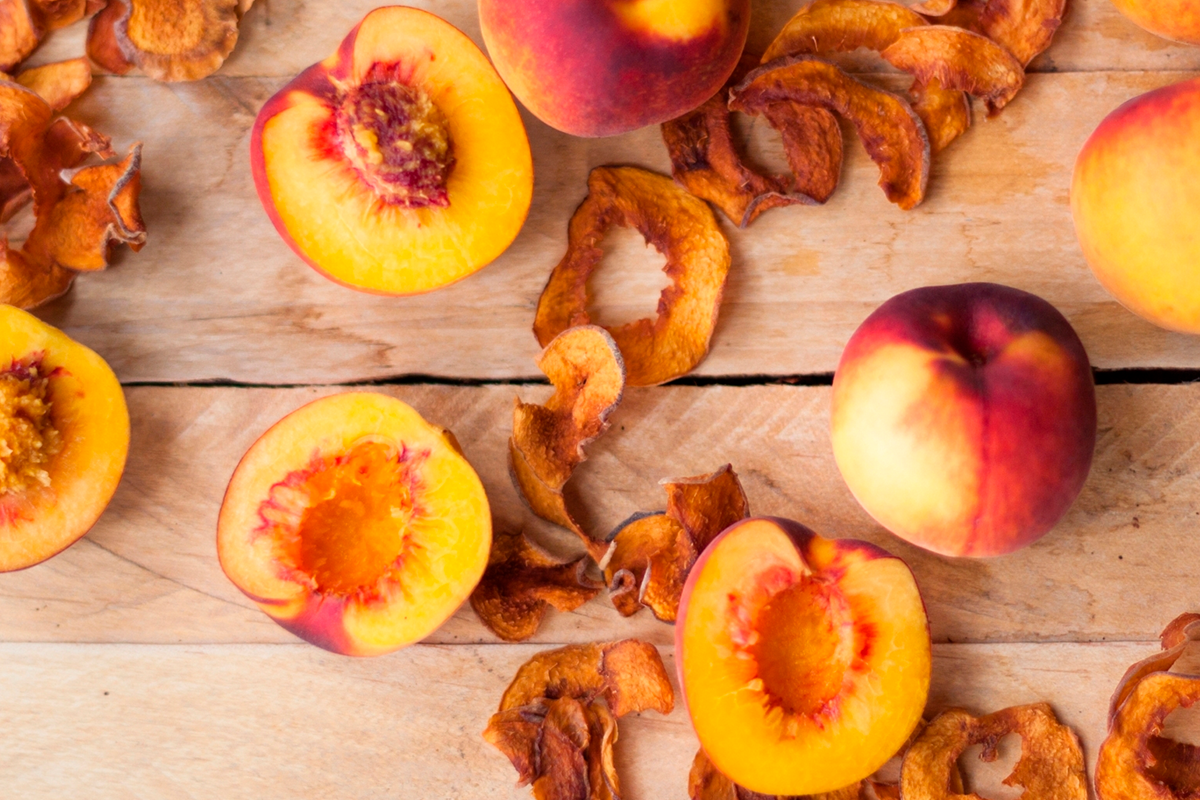 As frutas desidratadas são outra forma de armazenar o produto por longos períodos, e que tem diversos usos. Para comer como lanche, acrescentar à granola, em barras energéticas, saladas, vitaminas ou como você quiser. Além disso, são muito fáceis de transportar. Lembre-se de que quanto mais saborosos forem os frutos frescos, mais gostosos serão na forma desidratada. Então, escolha os pêssegos e descasque-os. Em seguida, coloque-os em água com 1½ colher de sopa de vinagre para não desbotarem, corte-os em fatias e coloque-os novamente em água com vinagre. Quando todos estiverem fatiados, descarte a água e disponha-os na bandeja do desidratador. Deixe-os ali por pelo menos 24 horas a 57 oC. Quando estiverem secos, guarde-os em um local seco e hermético. Outra forma gostosa de utilizá-los é para fazer mote con huesillos, um doce típico chileno que harmoniza muito bem com uma taça de Rosé Concha y Toro.