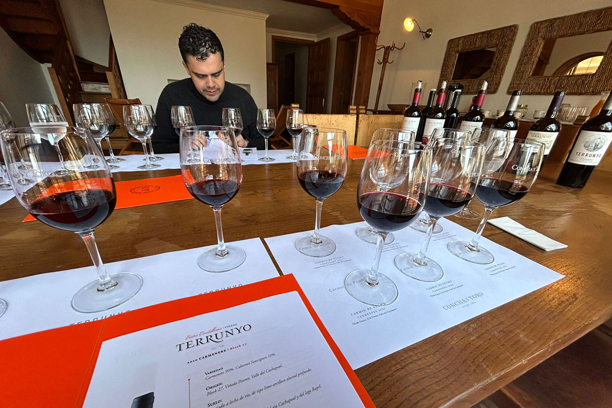A visita começou no vinhedo de Peumo, localizado no Vale do Cachapoal, onde Marcio Ramírez, enólogo da Concha y Toro, apresentou as qualidades únicas deste terroir, que o tornam um dos mais emblemáticos para a Carmenere no Chile. Em seguida, foi realizada uma degustação vertical das safras 2003, 2008, 2021 e 2022 do Carmín de Peumo, ícone Carmenere da Viña Concha y Toro, acompanhada por uma degustação das safras de destaque 2010, 2014 e 2022 do Terrunyo Carmenere.
