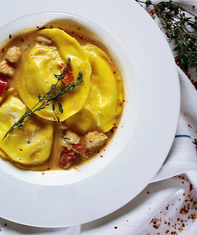 Pescados grasos, como mero, atún, salmón o corvina, preparados a la plancha y acompañados de salsas en base a crema; pastas rellenas de crustáceos, como cangrejo,