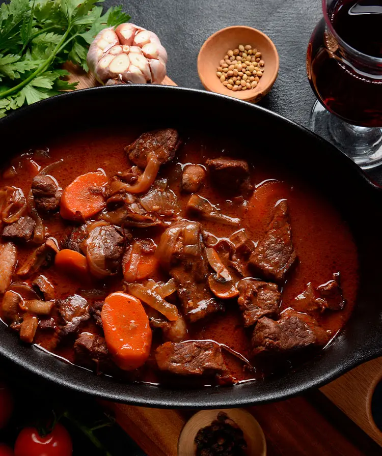 Carnes rojas y carnes de caza a la parrilla, asadas o guisadas en salsas intensas que tengan un toque de acidez (con tomate o vino) o hierbas como romero, tomillo y laurel; perfecto con la mayoría de los quesos.