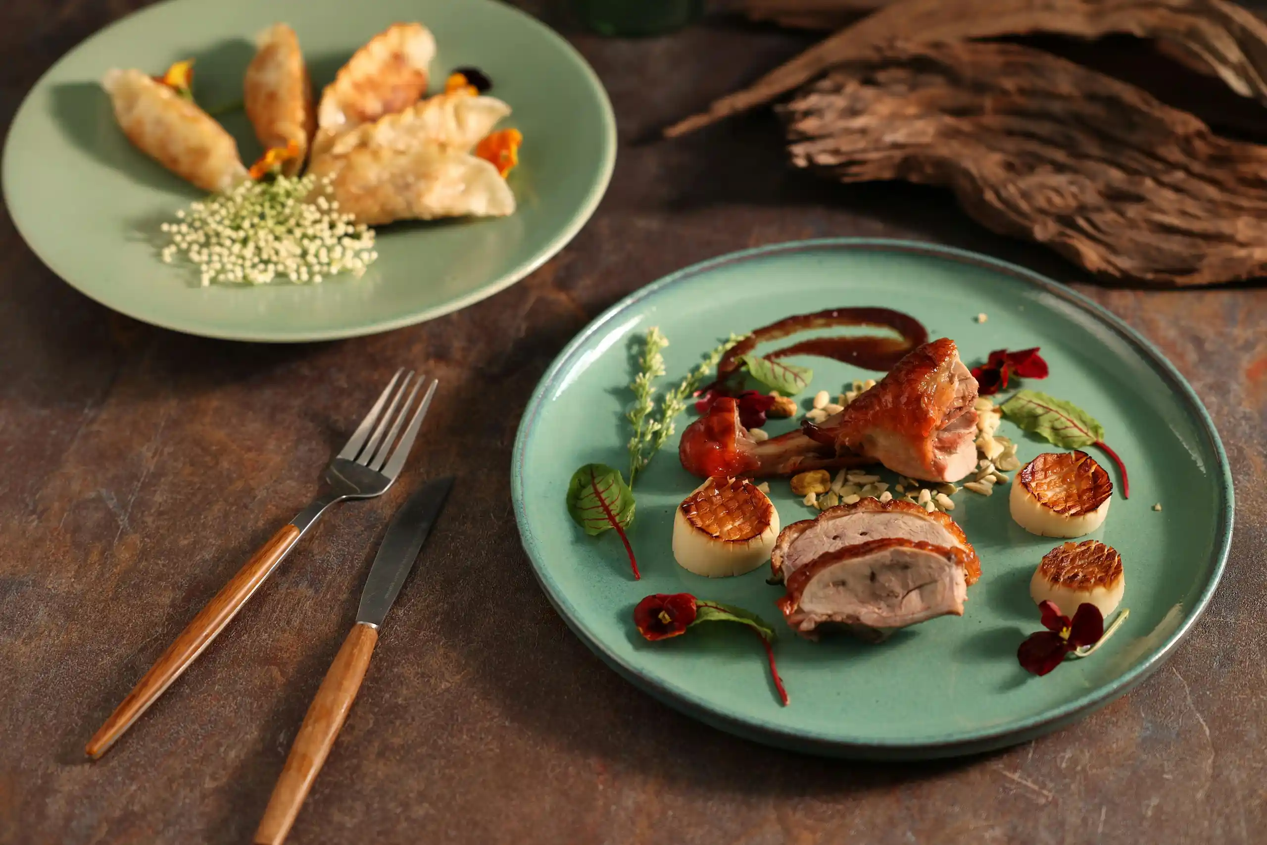 Cordero o cabrito asados; guisos sabrosos de cordero al estilo Mediterráneo; aves de caza, como pato y ganso, terrinas y patés de jabalí y cerdo.